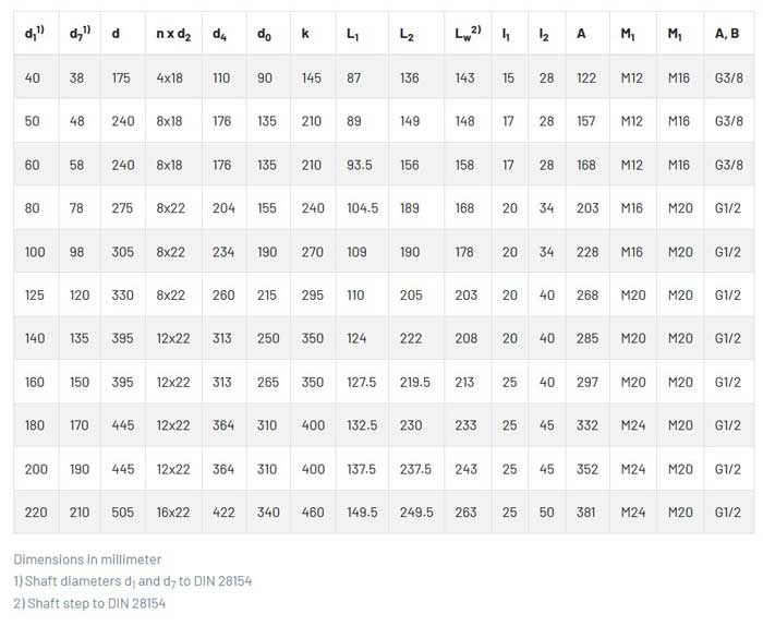 - قطر شفت: d1 = 40 … ۲۲۰ mm (1.57 اینچ … ۸٫۶۶ اینچ)